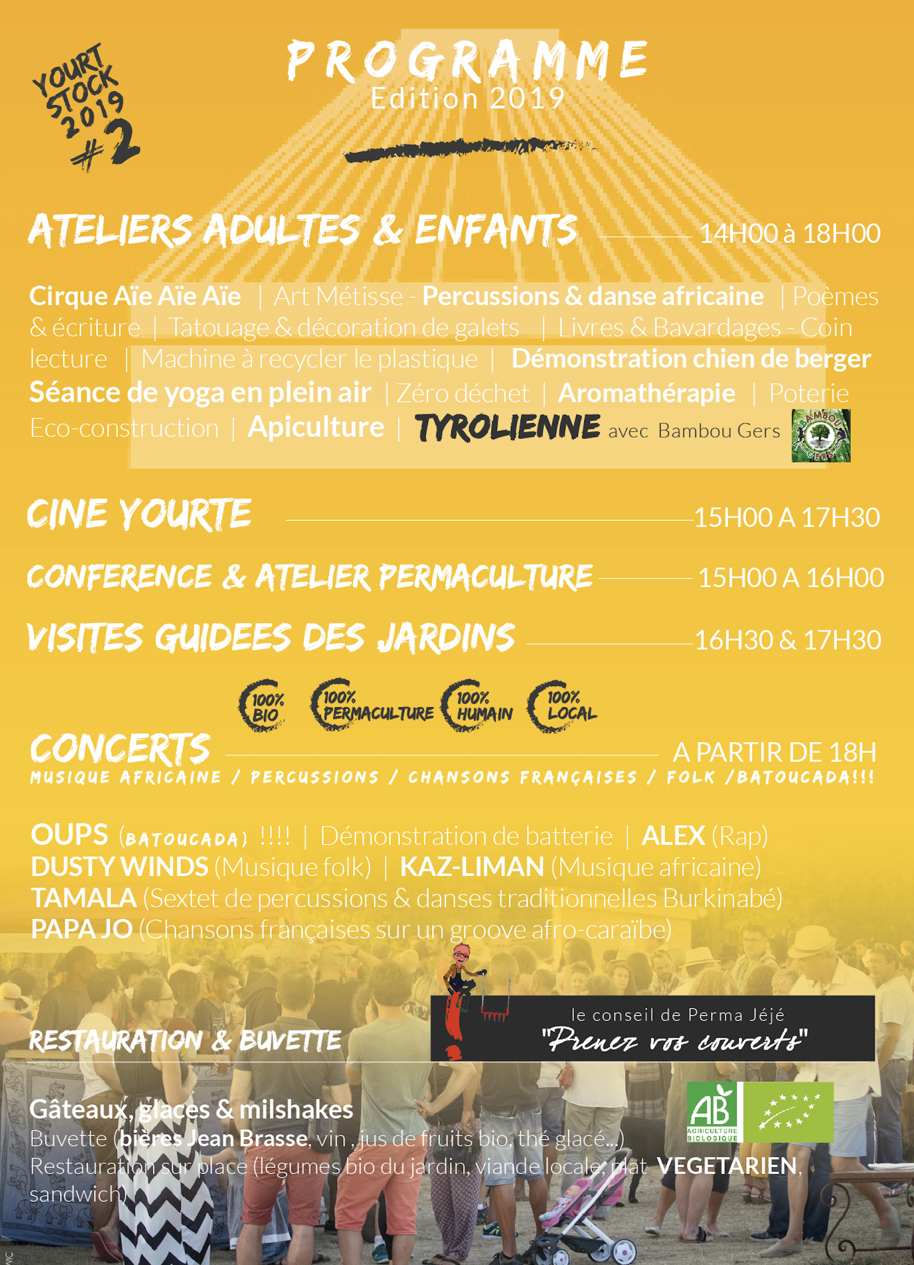 Yourt Stock est l’occasion de découvrir des Jardins en permaculture en famille, avec des amis…autour d’un verre, d’un repas partagé et d’une bonne musique !
